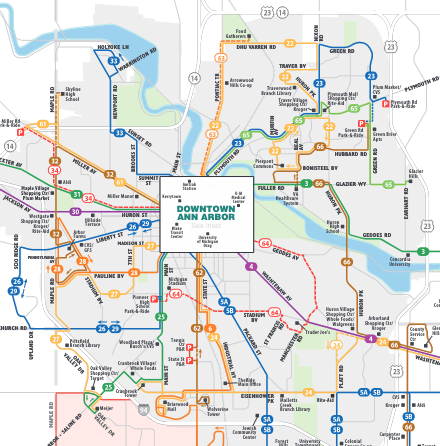 Now, compare this map to the maps of cities of comparable size that have good ridership (in the US, that would be the 7-10% of trips range). Here’s Iowa City, Iowa and Ann Arbor, Michigan; both college towns: