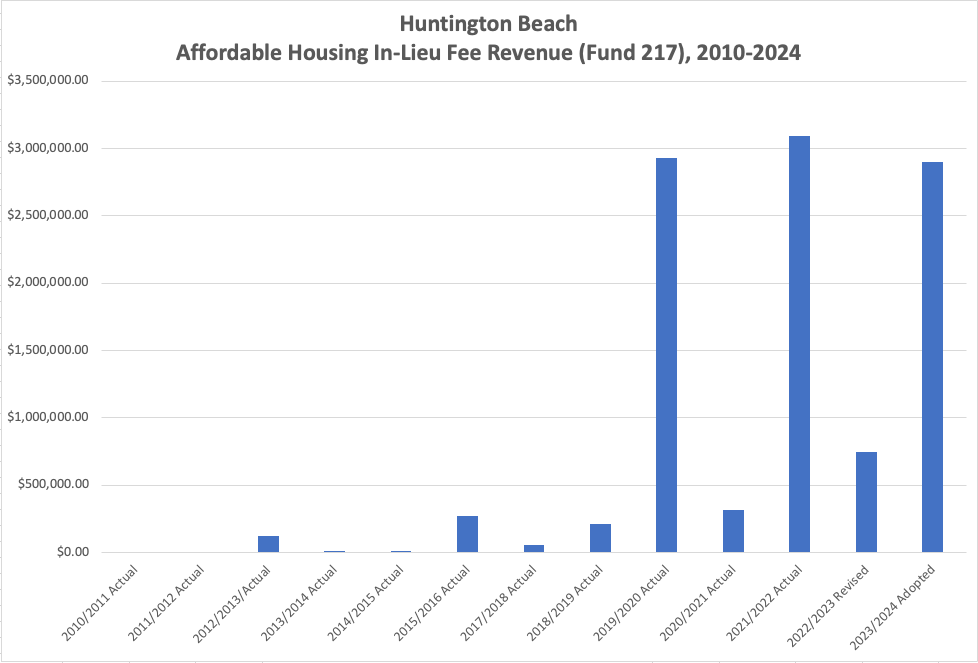 I can only speculate as to how this might have happened. My guess is that the cost of producing an affordable unit (in terms of capital costs as well as foregone future rents) was cheaper than the in-lieu fee before 2018 and then, after 2018, those costs started to exceed the fee. That could be because it got more expensive to build in Orange County (it did) or because rents were rising sufficiently quickly that the math of capping rents on 10% of a project’s units for 55 years was too painful to justify, or both.