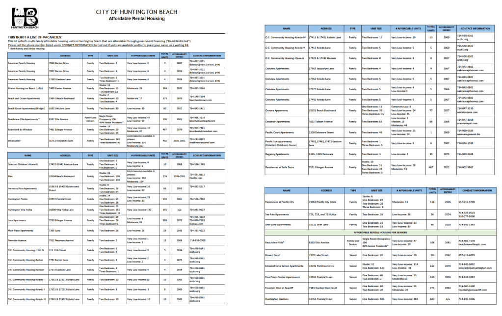 If you go to the Huntington Beach website, it helpfully discloses all of HB’s rental affordable housing units that the city is tracking in its system. It is a pretty impressive list that encompasses more than 2,500 units of deed-restricted affordable rental housing (don’t try and squint and read it; just know every row is a development containing affordable housing):