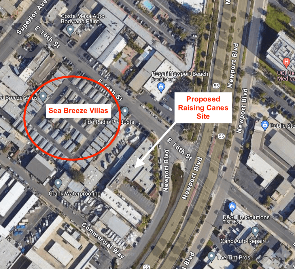 The particular details of the item aren’t all that captivating: in essence, a fast food chain, Raising Canes, is proposing to demolish a vacant building and put in its place a restaurant with a drive-through on Old Newport Boulevard. Setting aside the mundane details of code compliance, the only even remotely controversial aspect of the project is that the parcel is within 90 feet of a mobile home park, Sea Breeze Villas, which itself sits on a commercially zoned parcel and is “legally nonconforming” — in other words, the mobile homes technically shouldn’t be there, but have been grandfathered in as a permitted use.