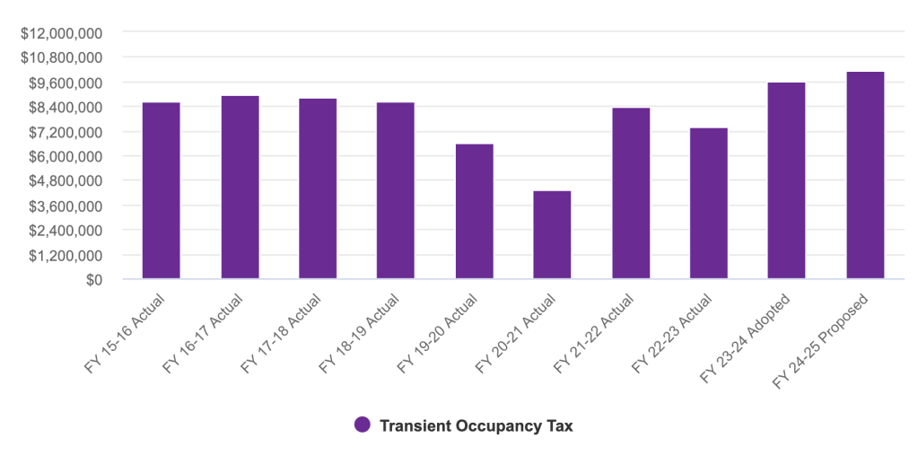 But shouldn’t Costa Mesa — famous for its art galleries, shopping malls, performing art centers and restaurants — be benefiting from an “experience” driven economy? Although we’ve recovered somewhat from pandemic, our transient occupancy tax (TOT) — a tax levied on hotels and other temporary accommodations, which is a good barometer for our tourism industry — is also flatter than it should be. At first glance, the chart below makes it look like our TOT is up compared to the pre-pandemic period. But the ~$8.4 million in TOT revenue we were averaging before the pandemic would be worth about $10.5 million in today’s dollars, meaning we haven’t grown our TOT as a share of revenue at all for over 10 years: