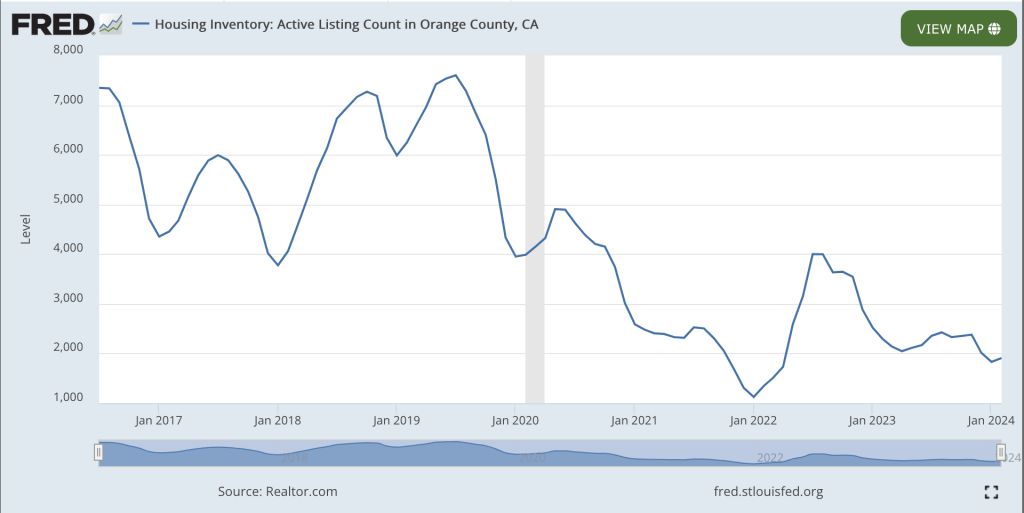What is going on? My fearful guess, without going too much on a housing tangent: housing and rent price inflation, coupled with high interest rates, have people locked in place and anxious about making big changes. Yes, unfavorable HELOC rates might be putting a damper in home improvements. But do you know what else would put a damper in home improvement spending? Very few people buying and selling homes, and fewer renters moving, too. Moving always spurs significant spending on construction and related customization, as well as home furnishings and decor. But many homeowners are stuck with low interest rate mortgages and astronomical market prices. And renters, too, increasingly find themselves in significantly below-market rentals thanks to statewide rent control coupled with market rents continuing to climb locally. Fewer people being willing to move means there are fewer available units on the market, which causes supply to dwindle and prices to continue to climb. Want to know how Costa Mesa has lost about 3,000 people from its population since 2018 while its real estate values continue to rise? This chart helps to explain it: