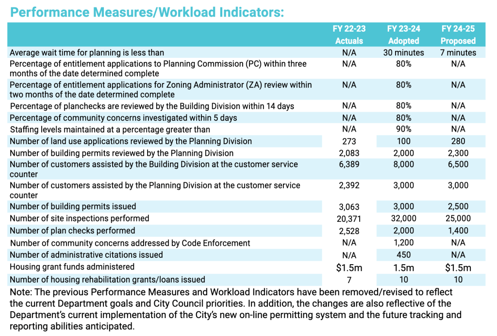 These metrics are remarkably unconnected to the experience of residents in the City with housing. Nowhere is there a report about the cost of housing year over year, either in terms of median rent or median home prices. There is no report on the availability of housing in the market, such as the month-to-month vacancy rate or the housing sale volume. There is nothing measuring the level of satisfaction experienced by customers using our planning department. And there is no context to the numbers that we do have that could help explain whether they are good or bad. For example, we administered $1.5 million of housing grant funds in FY 2022-2023. How many people did those fund help stay in housing? Are those dollars expected to help more or fewer people in the coming years? It doesn’t say.