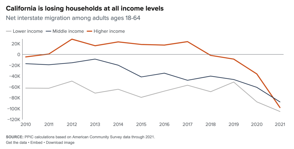 Most directly, populations rise when: (births + migration inflows) > (deaths + migration outflows), and of course decline when the opposite is true. California has famously been losing residents at all income levels to other states pretty steadily for the last 12 years, with wealthier residents recently catching up with the lower classes in terms of rate of flight: