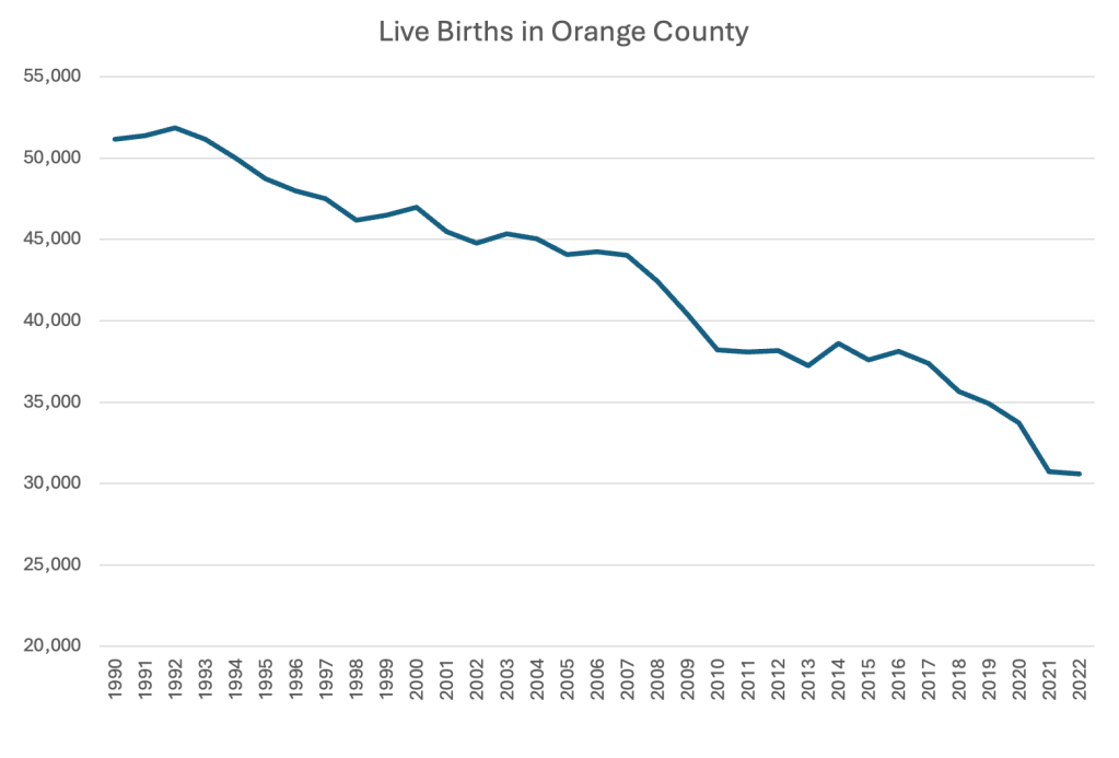 But it’s not just migration outflows. Our birthrates are pretty awful, too. Here’s Orange County’s tally of live births since 1990: