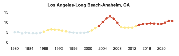 Red dots mean bad. Right around 2015 — when our area re-entered the “red zone” in the graph above – the Legislative Analyst’s Office of the California Legislature put out a report that outlined the consequences of extremely high housing unaffordability: it warned that such a condition would likely reduce overall economic activity as residents spend more and more on housing costs, increase crowding (as the negative consequences that come with that, such as crime, higher burdens on municipal services and lower educational achievement), reduce home ownership rates, increase commute times, and undermine recruitment for both the private and public sector. Now, with more recent research, we can likely add increased rates of homelessness to the parade of horribles as well.