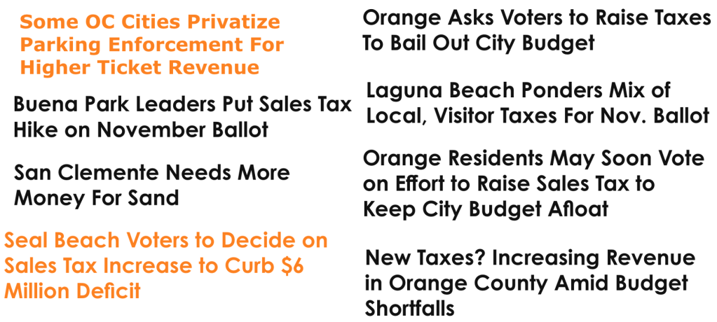 Huh. Why would all these Orange County cities be hunting for revenue? It’s seems a bit odd. We’ve been experiencing several years of persistent high inflation. Shouldn’t that be pushing up sales tax revenue? Additionally, the red hot real estate market of 2021-2022 saw a huge number of homes turn over, which should have reset their property tax bases to our present sky high prices under Proposition 13. And besides: didn’t cities just have millions of dollars airdropped onto them by federal COVID relief? Costa Mesa was still trying to spend this money as recently as last year. So what gives?