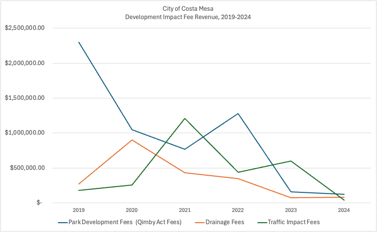 This one is going to get me ranting. The City has put out a notice containing it 2023-2024 impact fee report, and unsurprisingly our tepid development has resulted in tepid development impact fees. Do you know what this miserable chart says to me?