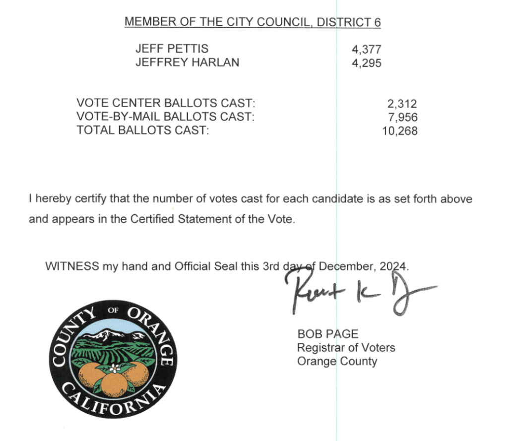 After weeks of counting, the final race in the Costa Mesa city council election is done and dusted. We have a new representative for District 6, with challenger Jeff Pettis knocking off incumbent and current Mayor Pro Tem Jeff Harlan.
