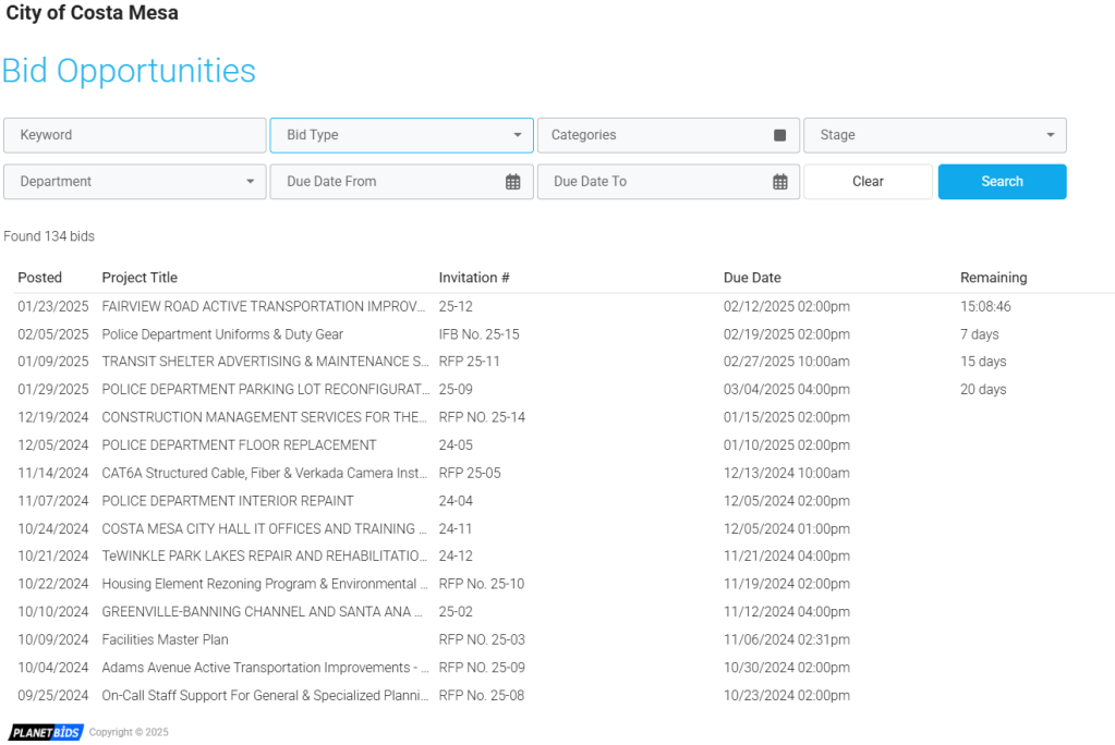 And now, here are all of the requests for proposals (RFPs or “bids”) that the City of Costa Mesa released since the date of Sept. 2024 Parks CIP Update (September 12, 2024) through the present: