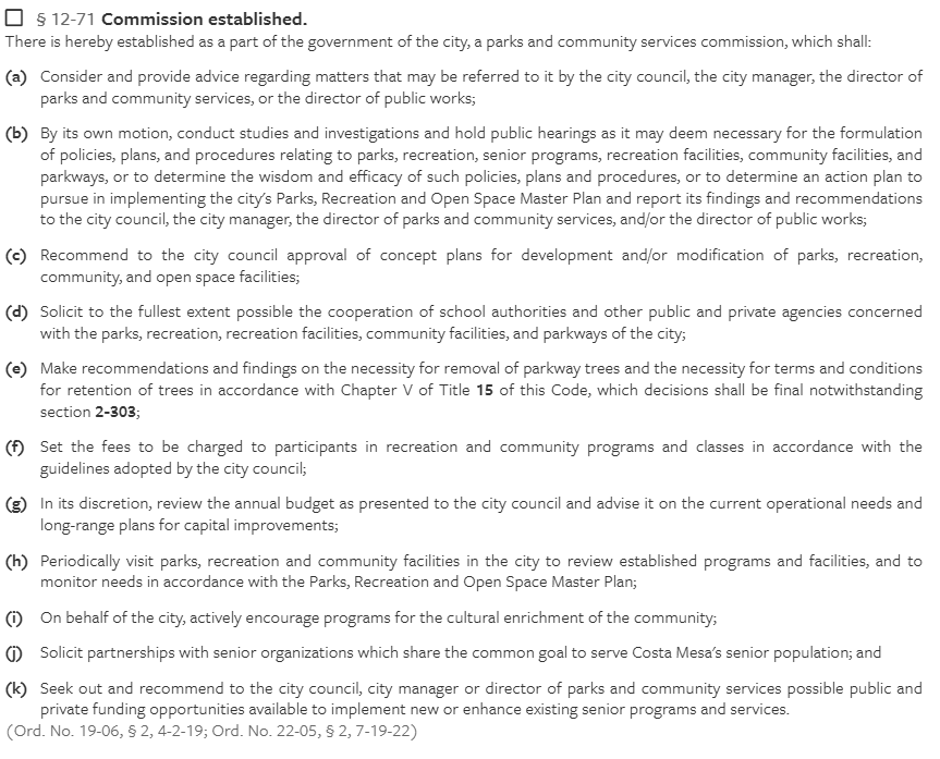 The code section above sets out the powers and duties of the PACS Commission, which, remarkably, more than rival the power and scope of the Planning Commission. I would particularly zoom in on subparagraphs (b) and (g). These subparagraphs give the PACS Commission independent power to set its own agenda, to conduct its own investigations, and to separately evaluate the capital improvement plan and to advise the City Council on the highest priority needs. This is incredible authority: not even the City Council has the ability to independently set the meeting agendas, as member-requested items still have to be vetted by the City Manager and the City Attorney.