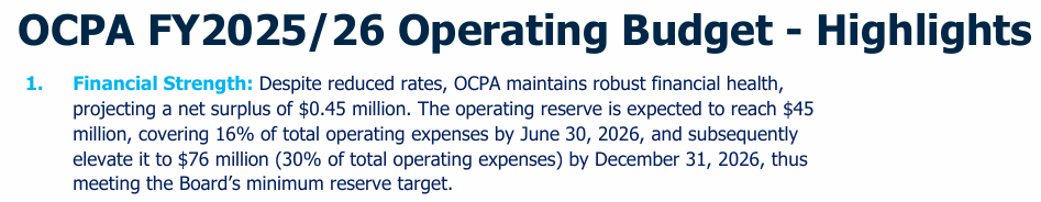 First, while OCPA is certainly on a better financial footing than it once was, it isn’t rock-solid yet. For example, take this screen grab from the OCPA’s 2025-2026 budget presentation earlier this year. While it has about 16% of operating expenses on hand in terms of reserves, that’s only about half of the minimum 30% set by the OCPA board. How will the OCPA nearly double its reserves next year when its net surplus this year was only $0.45 million?