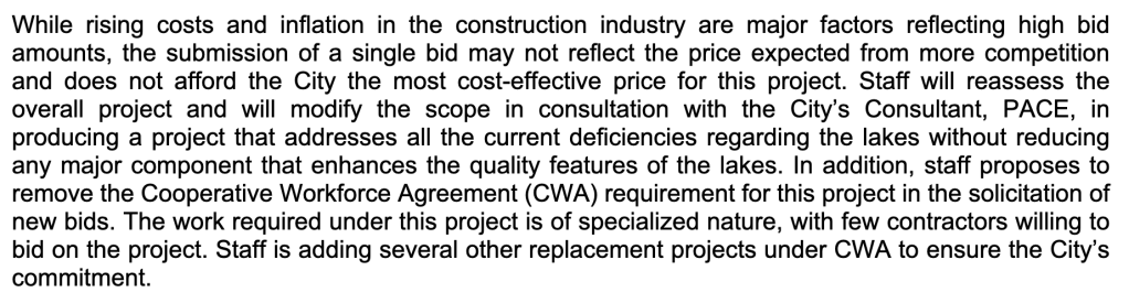 Well, to my knowledge, Staff never publicly followed up on this “proposal” or on what projects were added as “replacement projects”. In the agenda report attached to the TeWinkle lakes project presented last Tuesday, there was zero mention of the CWA — even though the project’s development timeline was discussed at length and the Staff had clearly fingered the application of the CWA as a significant factor in the failure of the first bid.