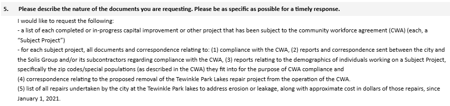 Frankly I think it’s arguable that the city violated the CPRA in its response to my request. If the Staff unilaterally removed this project from the scope of the CWA, and if that decision had been made before March 2025, my request would have pertained to internal correspondence regarding a final, completed decision: not a decision that was in the midst of being deliberated or that would be considered a “preliminary draft”. And if the decision had already been made, the clerk’s response that it could not confirm whether Staff had discussed with CWA counterparties is, at best, misleading.