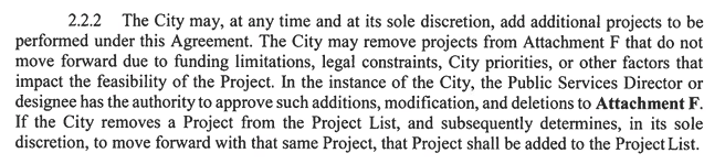 And yet, the TeWinkle lakes project is moving forward (it squeaked through on a 4-3 vote last Tuesday night). Setting aside the issue of whether such a removal is a violation of the CWA — I assume the CWA counterparties haven’t complained, or else we’d be having a different conversation — this language makes me question whether the City Council actually delegated unilateral authority to the Staff to remove projects from the CWA that nonetheless move forward at the time the City Council approved the CWA. I don’t think it did. Instead, this language, especially the last sentence of Section 2.2.2, makes it pretty clear that Staff can’t just remove a project from the list to so that the CWA’s requirements can be avoided altogether.