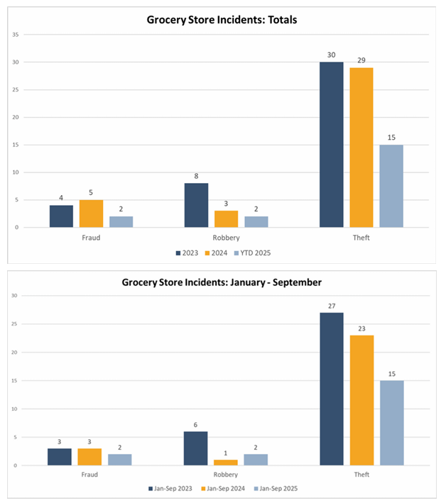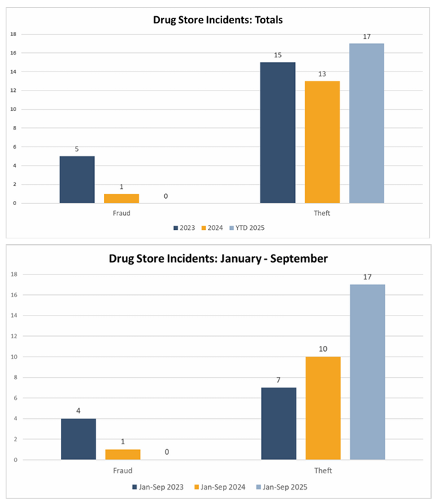 First, while drug store thefts are definitely up, grocery store thefts are way down from 2023. Given that our local qualifying drug stores are already complying with the 1:3 self-checkout staffing ratio but our grocery stores are not, this data seems to throw a big bucket of cold water on the notion that self-checkout staffing is the key to theft deterrence.