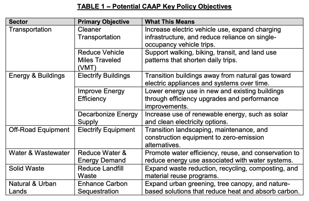The outreach and data gathering process for the Climate Action and Adaptation Plan (CAAP) will get reviewed tonight. Keep an eye out for discussions of the following table, which will give us a hint of where the CAAP will eventually go. Why does this matter? Because the policies outlined in the CAAP will provide direction for pursuing external grants from the State and Federal governments, which in turn will help shape future capital spending in this area: