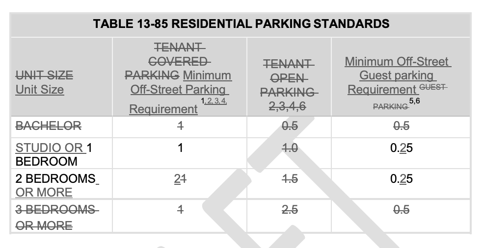 I could be mistaken but it sure looks like the city has done away with “tenant open parking” requirements, and by implication, reduced the total required parking by 0.75 parking spaces for 2-bedroom units and by 1.75 parking spaces for 3+-bedroom units.